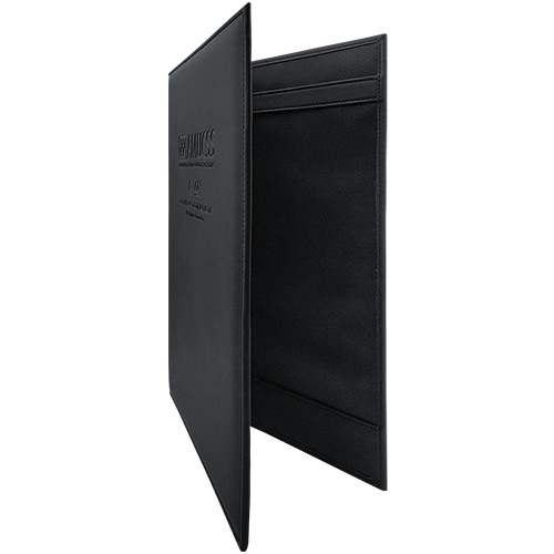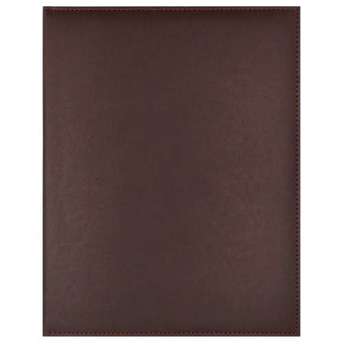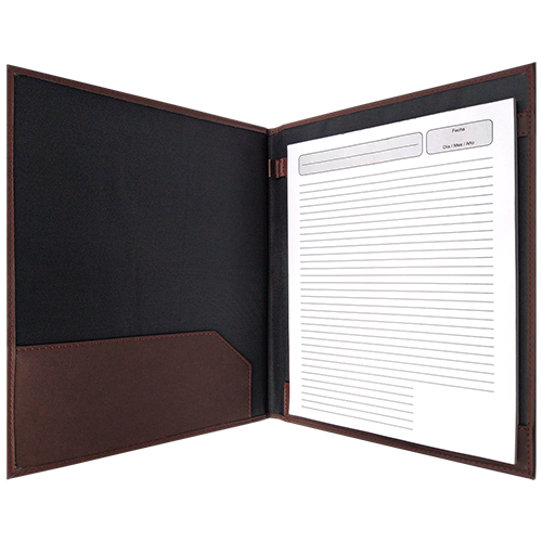 Descripción: Cartón importado, forro nylon interior, solapa con tarjetero, tira porta block con descanso y porta pluma