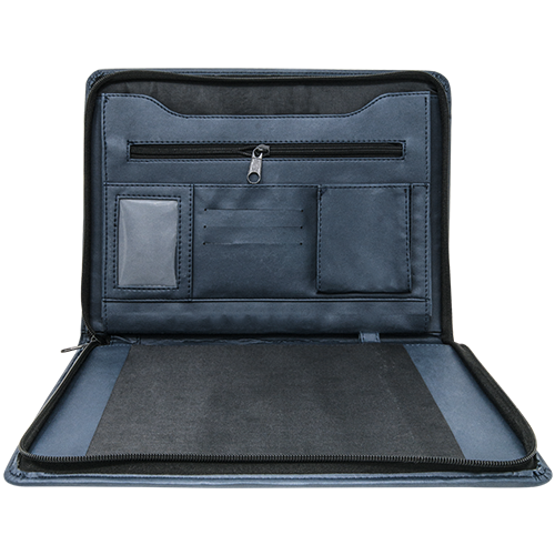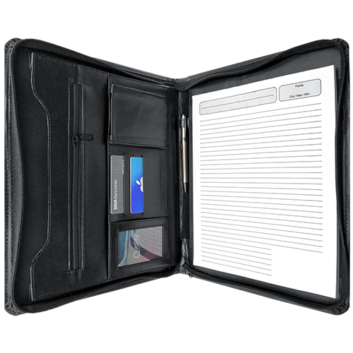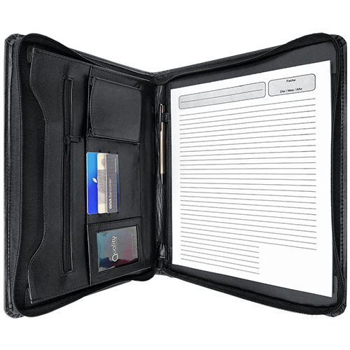 Descripción: Cartón importado, forro nylon interior, compartimento interior con tarjetero, porta block porta pluma y cierre.